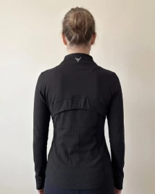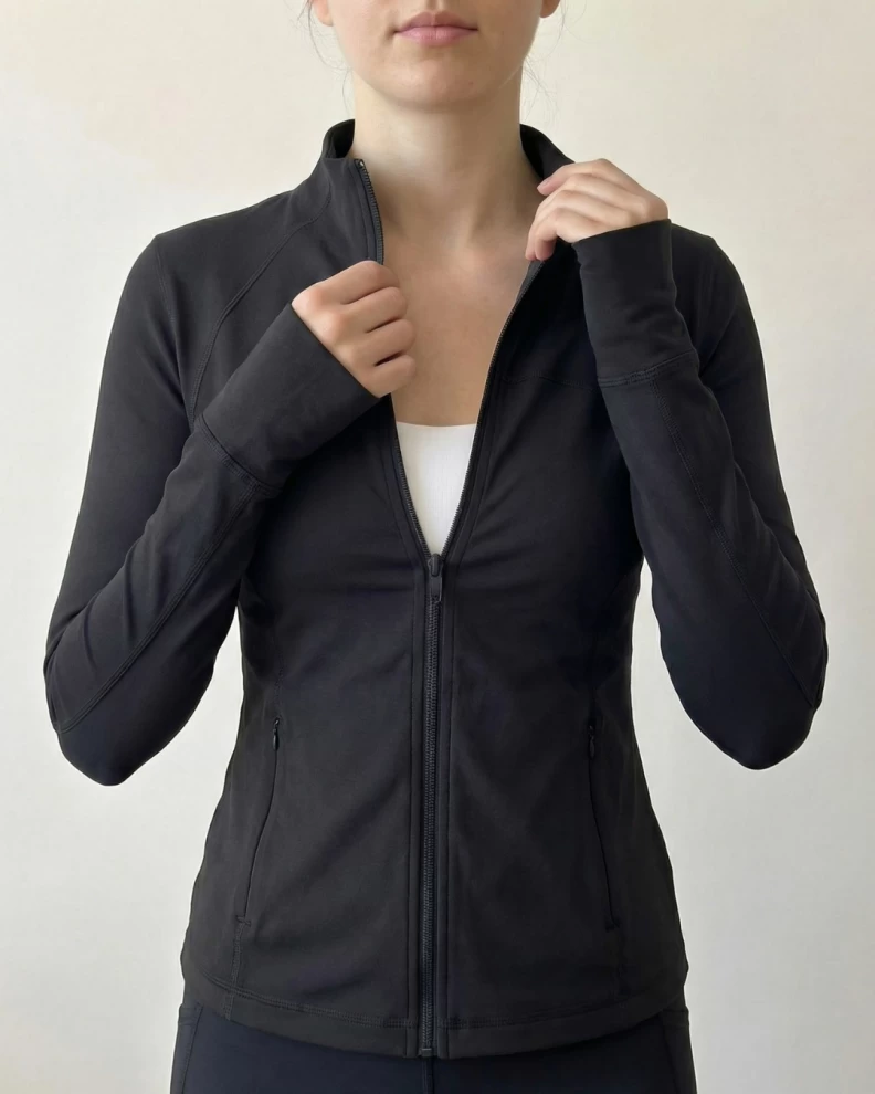 Full-length front zipper with a high neckline for added coverage and warmth. The jacket is designed with contoured seam lines that enhance shape and provide a flattering, streamlined fit. Made from a smooth, stretchy performance fabric.